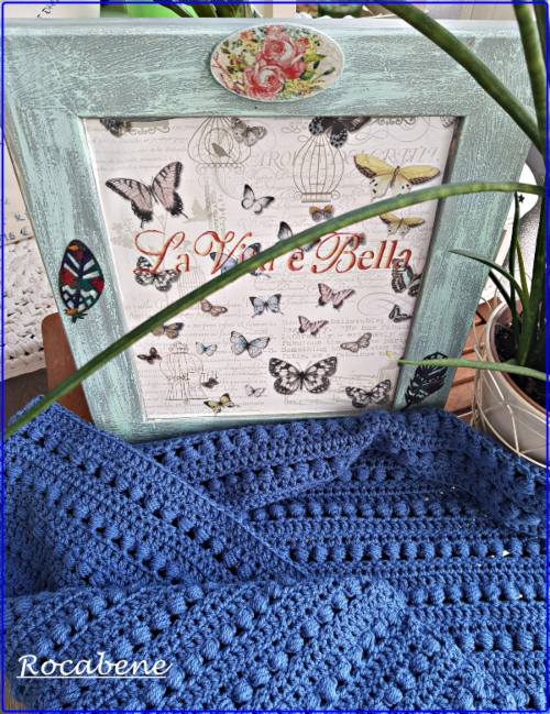 No ha resultado nada fácil, después de acabada la manta, de encontrar el “otro” azul que debería rematar el borde  y que realzaría todo el conjunto.